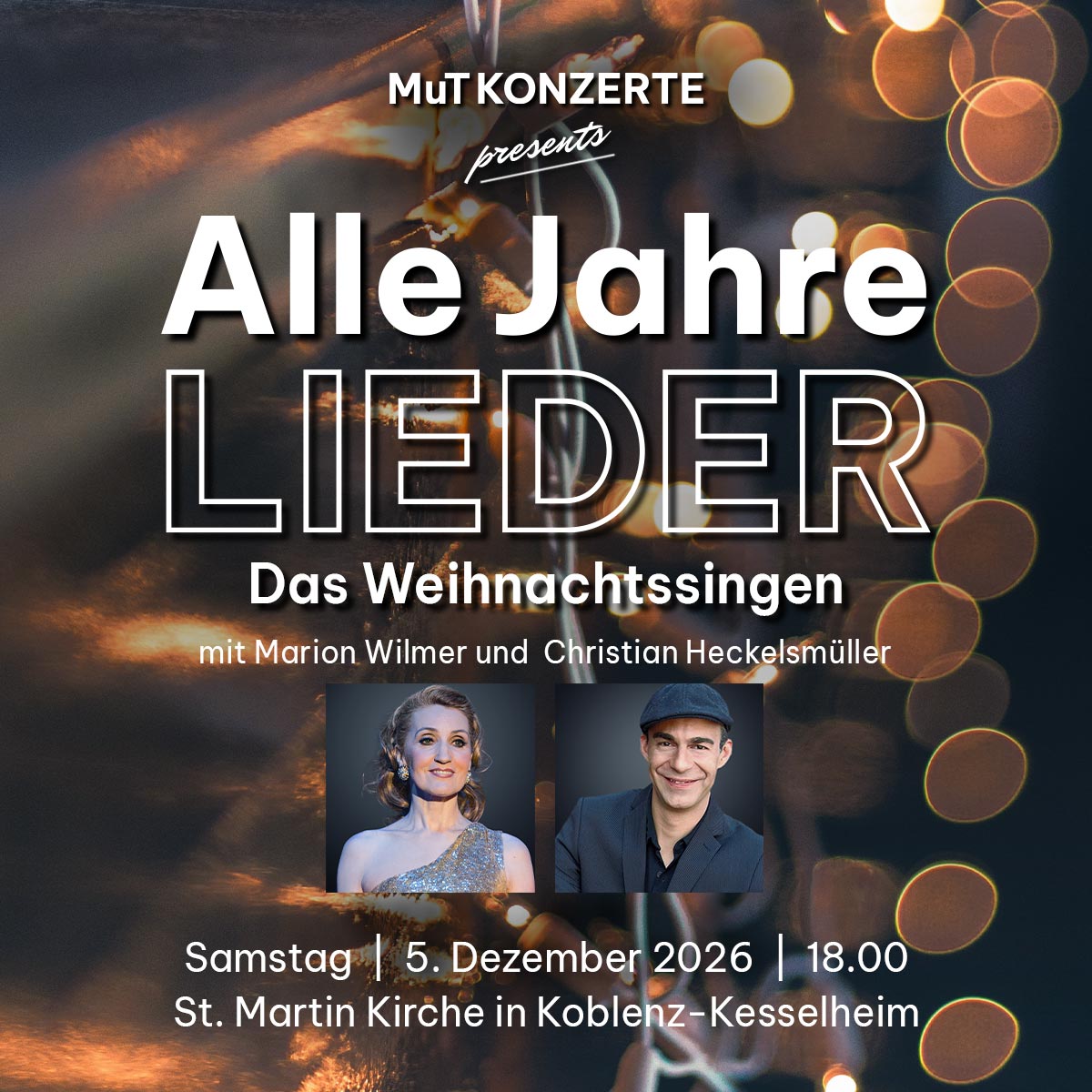 Mit dem neuen Programm von ‚Alle Jahre Lieder‘, dem erfolgreichen weihnachtlichen Mitsingen, lädt MuT-Konzerte auch in diesem Jahr wieder zu besonderen Adventsabenden ein. Das Programm wird von Marion Wilmer (Gesang) und Christian Heckelsmüller (Klavier und Gesang) gestaltet, die als namhafte Größen der deutschen Musicalszene das Publikum gemeinsam auf die Adventszeit und Weihnachten einstimmen.